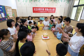 “大朋友”和小朋友们一起许愿、吹蜡烛,分享甜蜜的蛋糕